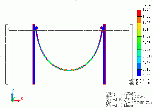 変形の状態や変位分布、応力分布を解析結果として見ることができます。