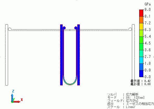 plateボディの曲げ変形は中央部分に集中しているため、応力の集中も同じ部位に発生していることが分かります。