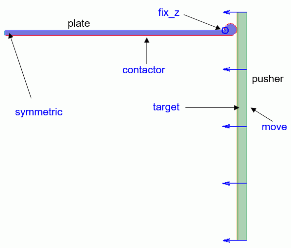 曲げる板材(pusher)には被接触面(target)および変位境界(move)を設定しています。