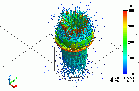 磁石に働く電磁力や電流密度、磁界ベクトル、磁束密度ベクトルを解析結果として見ることができます。