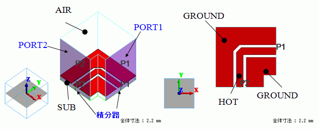 アルミナ基板(SUB)上にコプレーナ線路のパターンを作っています。コプレーナ線路を構成する電極はソリッドボディで定義しています。