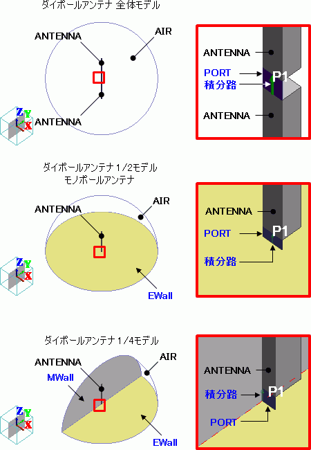 ダイポールアンテナの全体モデル、1/2モデル、1/4モデルを示しています。