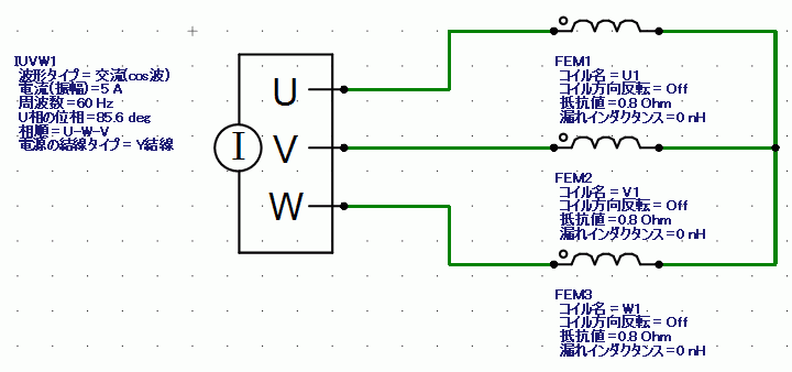 外部回路入出力値換算をONにしているため、FEMコイル素子の抵抗値には1/4分ではなく、フルモデル相当の相抵抗を設定しています。