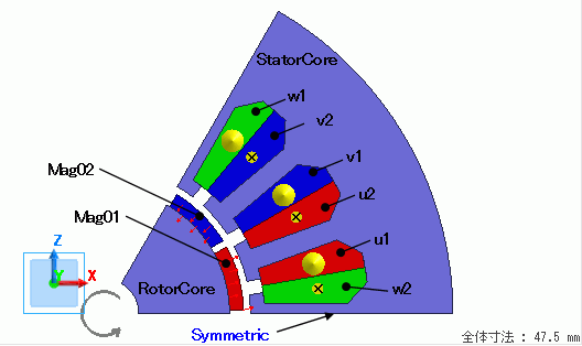 ステップ数が180で、周方向メッシュ分割角度が1.0[deg]、1ステップ当たりの回転量が1[メッシュ]ですので、機械角で180*1.0*1=180[deg]まで回転させる解析となります。