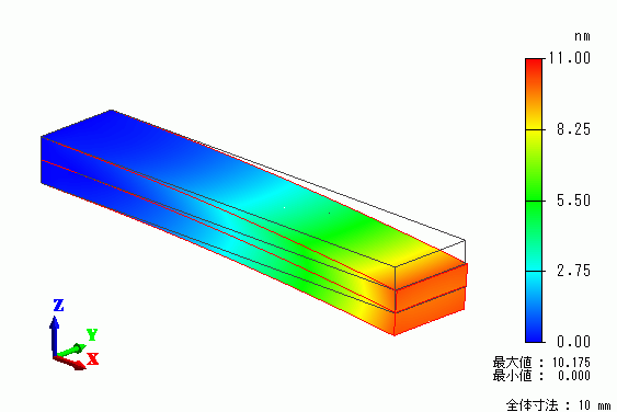 素子の変位量のグラデーションコンター図を示します。カラーコンタは変位の大きさを表しております。