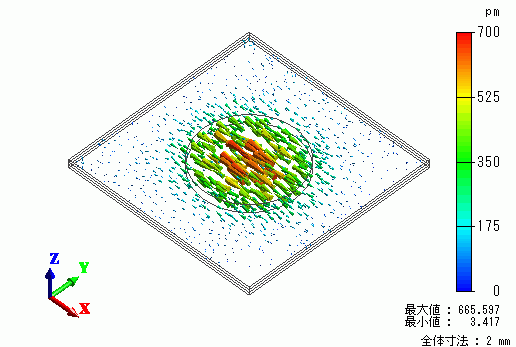 18.3[MHz]における厚みすべり振動を計算すると、以下のような変位ベクトル図が得られます。