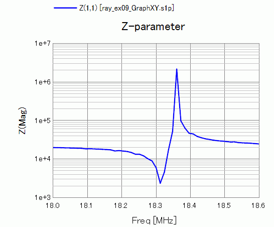 18.32[MHz]付近に共振周波数、18.36[MHz]付近に反共振周波数が存在することが分かります。