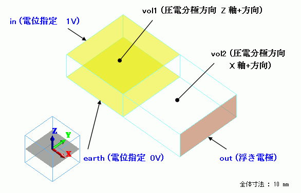 圧電体vol1とvol2の分極方向をそれぞれZ軸方向とX軸方向に設定するため、