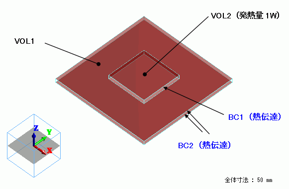 基板(VOL1)と発熱体(VOL2)それぞれを直方体のソリッドボディで定義し、発熱体にはボディ属性で発熱量を設定、