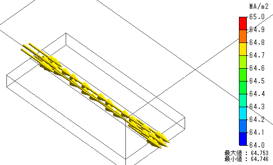 電場解析結果として電流密度ベクトルを示します。電位差によって配線に電流がながれていることが確認できます。