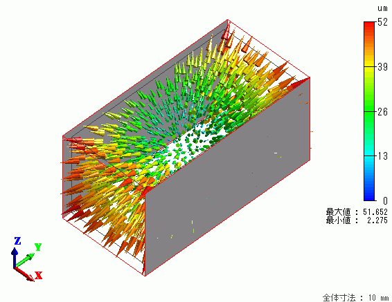 温度上昇によって熱膨張が発生していますが、等変位(グレー部分)についてはX方向に変位はしていますが、面そのもの
