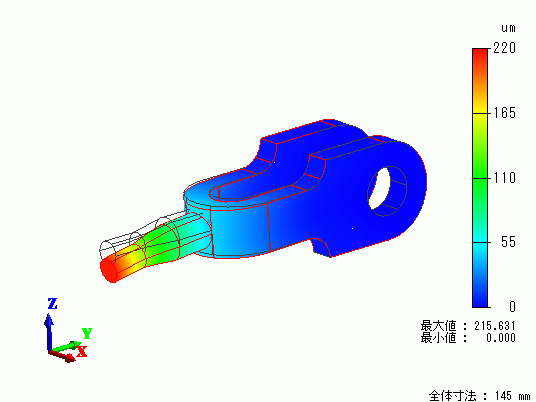 穴開き工具の先端へいくほどZ軸マイナス方向への変位が大きくなっている様子が分かります。