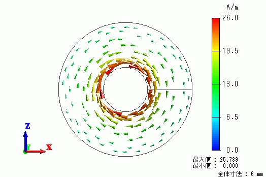 電界および磁界分布の解析結果を以下に示します。(上図:電界ベクトル、下図:磁界ベクトル)