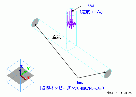 水平パイプは十分長いものとし、途中で切り、その切断面に音響インピーダンス境界を設定しています。