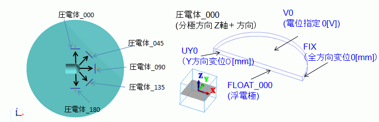 圧電体のみを表示して、上図のX軸正方向にむかって見たのが下図です。半円状の圧電体の色は、浮電極の電位を表しています。圧電体右側に示した数字は浮電極の電位です。