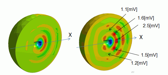 結果図1(a). 圧電体を取り除いたモデルの 結果図1(b).圧電体を含むモデルでの音圧分布(参考)