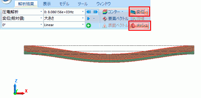 共振解析の結果の変位図を、メッシュ図とともに示します。