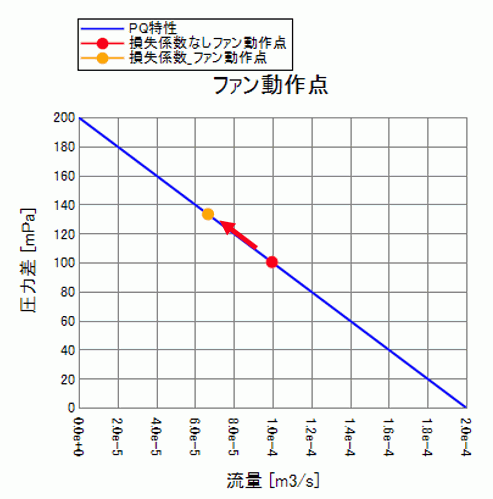 流入口の圧力損失がある場合、ファンの効率が悪くなるため、動作点はが流量が低い側にシフトしているのが確認できます。