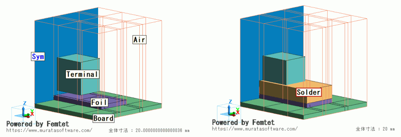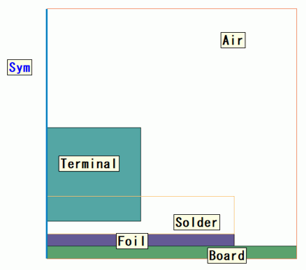 VOF法を用いて、端子と銅箔の間に形成されるはんだの形状を計算します。