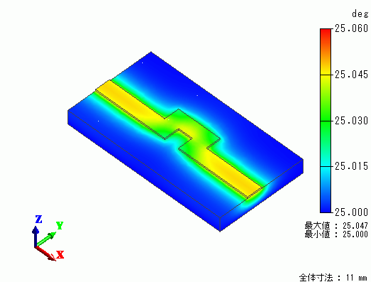 その電流に起因するジュール熱によって発生した温度上昇分布をシミュレーション(熱伝導解析)した例を示します。