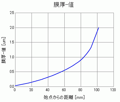 図2に、図1の右下の頂点を始点とし、右上の頂点まで、陰極に沿った線上の膜厚を表示します。