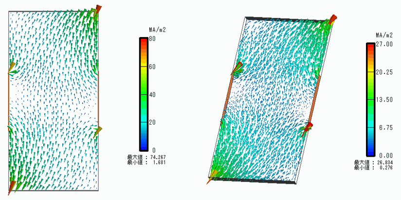 ホール効果によって電位分布、電流分布双方にひずみが発生していることが分かります。
