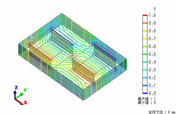 電界分布や電位分布を解析結果として得ることができます。
