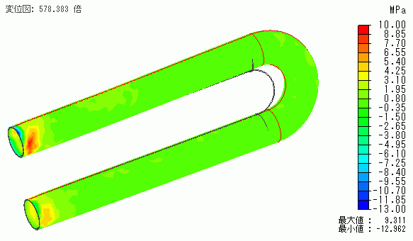 チューブ内を流れる熱流体の温度分布からチューブの変形形状や応力を解析することができます。