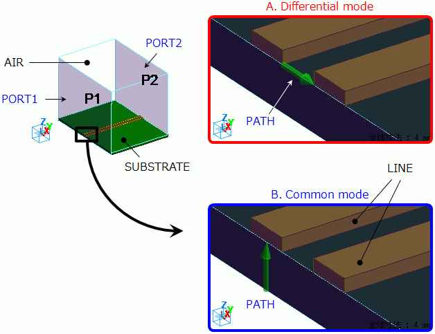 ポートには積分路を設定しますが、差動モードの解析を行う場合とコモンモードの解析を行う場合とで