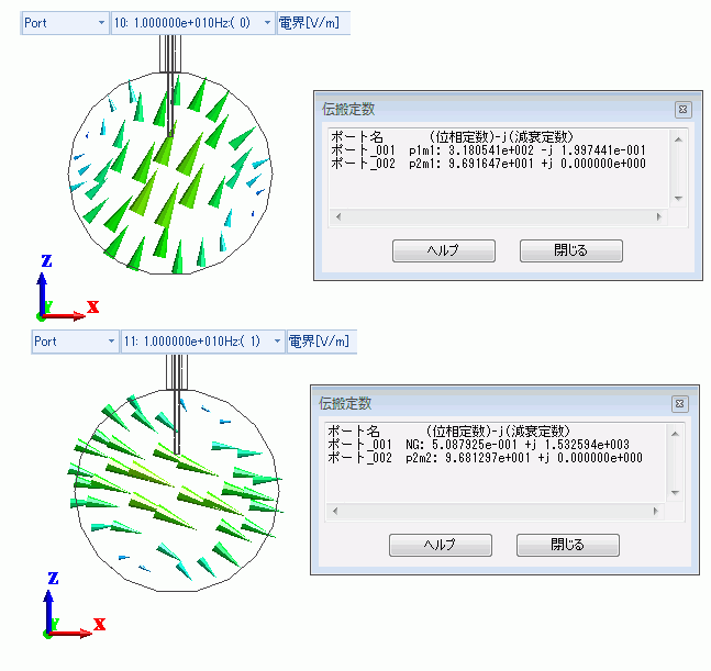 という表示から、ポート_002上に表示されているモード(上段左の図)が、SYZ行列のポートインデックスとして表示