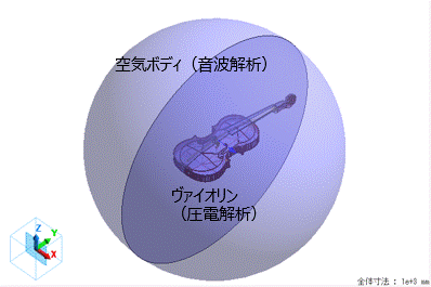 全体のモデルは、下図のように、圧電解析領域のヴァイオリンと音波解析領域の空気からなります。