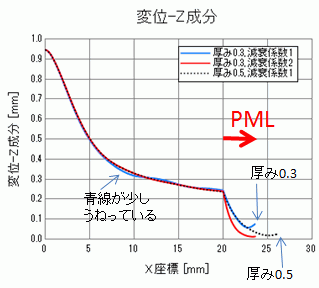 0.3⇒0.5に修正した結果を黒点線で表しています。PMLを除く解析領域において、赤実線と黒点線は一致していて、カーブはな