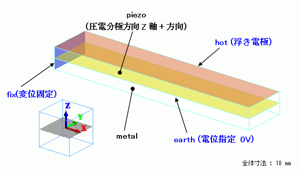 短冊形状の金属板と圧電体から構成された素子が加速度によって変形した状態を解析します。