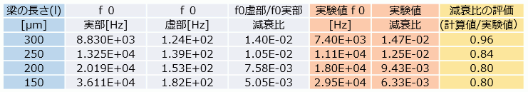 結果として得られた複素共振周波数(f0)を表に示しました。 減衰比は、f0の実部と虚部の比として求め、文献[3]に掲載された実験値と比較を行いました。