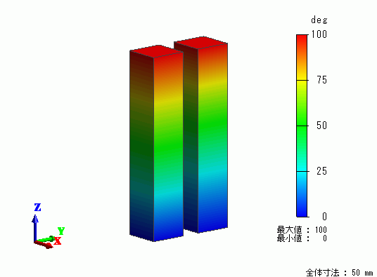 異なる熱伝導率を有する導体材料に共通の温度境界条件を与えた場合の過渡解析例を示します。