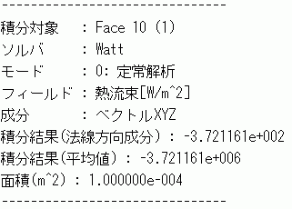 また、計算結果画面からの積分実行を用いてボディ上面の熱流束を積分し、ボディ上面を通過する熱量を計算した結果を以下に示します。