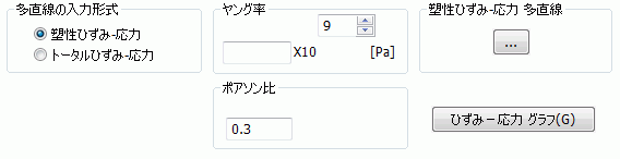 入力形式「塑性ひずみ-応力」では、ヤング率、ポアソン比を定義し、