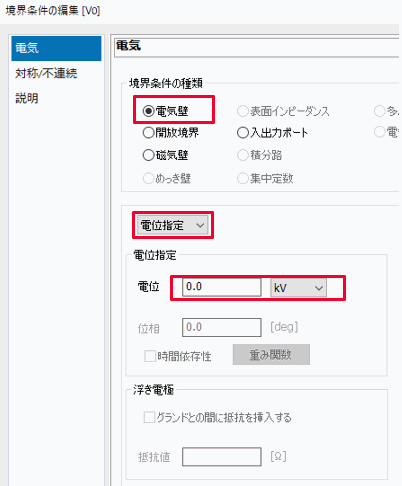 電場解析の設定は以下のように行います。