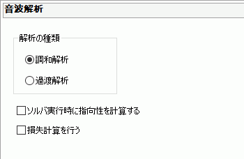 調和解析でのみ使用できます。 チェックを入れると、音波指向性計算タブの入力が可能になります。計算する指向性の内容は、以下の通りです。