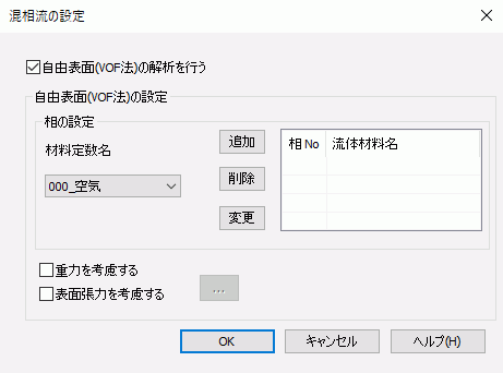 チェックを入れることで、自由表面(VOF法)の解析を行うことができます。 詳細はテクニカルノート「自由表面解析(VOF法)」を参照してください。 |