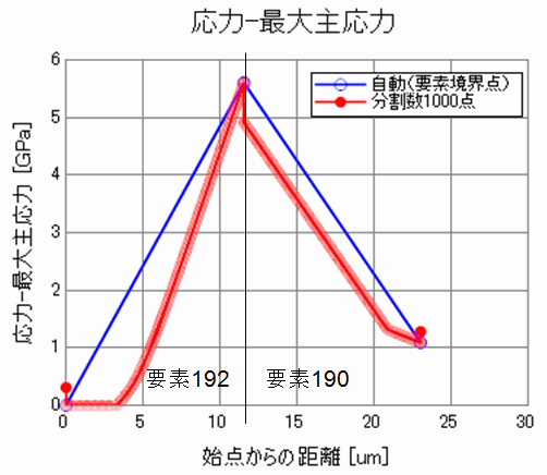 分割数1000点では、平均化ONと同様、要素192と要素190の境界の左右で異なる値になっているのが分かります(要素内部の計算方法を適用)。