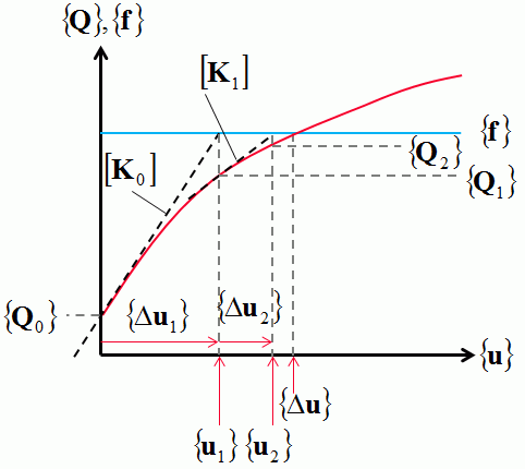 {f}と{Q}が交わるときの変位増分{Δu}が正しい解となります。