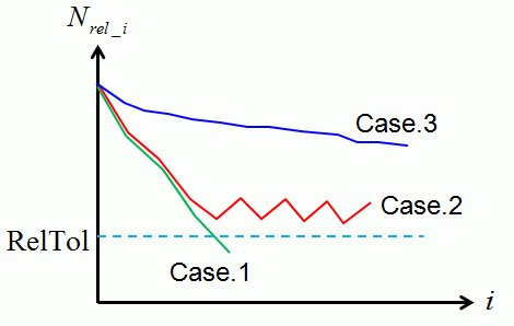 通常は、Case.1のように、誤差が単調減少していき、収束判定基準を下回り、収束します。