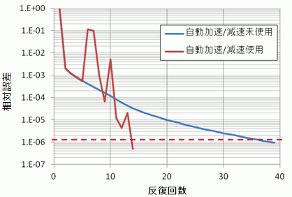 自動加速/減速を使用した場合、減少の仕方は単調減少ではありませんが、より早く相対誤差が減少している様子が分かります。