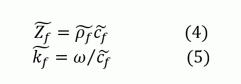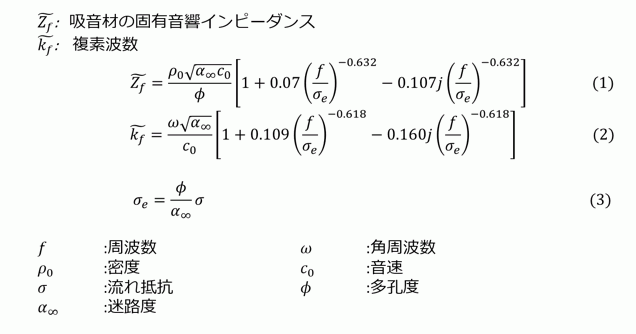Femtetで使うには、密度、音速に変換する必要がある。 得られた固有音響インピーダンスと、複素波数から、 実効密度、複素音速 へは、以下の(4),(5) の関係を使って、変換する。