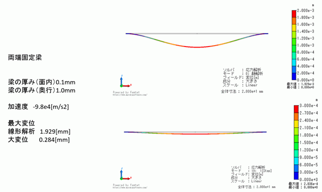 同様の事を両端固定梁で行いました。円板の場合と同様、線形解析と非線形解析には大きな差が見られました。