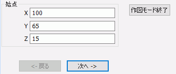 パラメータ入力ダイアログに始点(X:100、Y:65、Z:15)を入力し、をクリックします。
