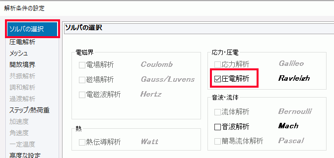 [ソルバ 解析の種類に応じて、電磁界や応力を計算するソフトの選択]タブで[圧電解析 Rayleigh (レイリー) Femtetの圧電解析ソルバの名称、もしくは人名]にチェックします。
