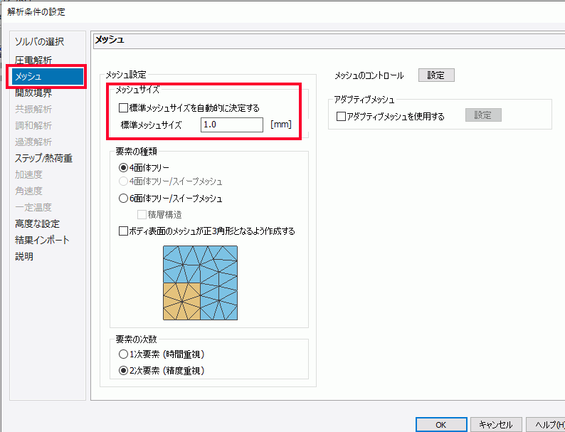 [標準メッシュサイズを自動的に決定する]のチェックをはずし、[標準メッシュサイズ]の項目に1を入力し、