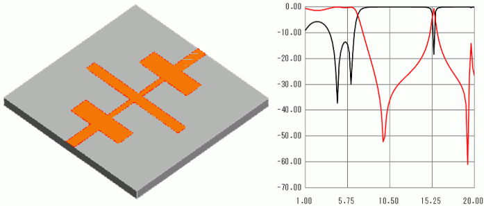 以下の図はスタブ付マイクロストラップ線路の周波数特性を解析した事例です。
